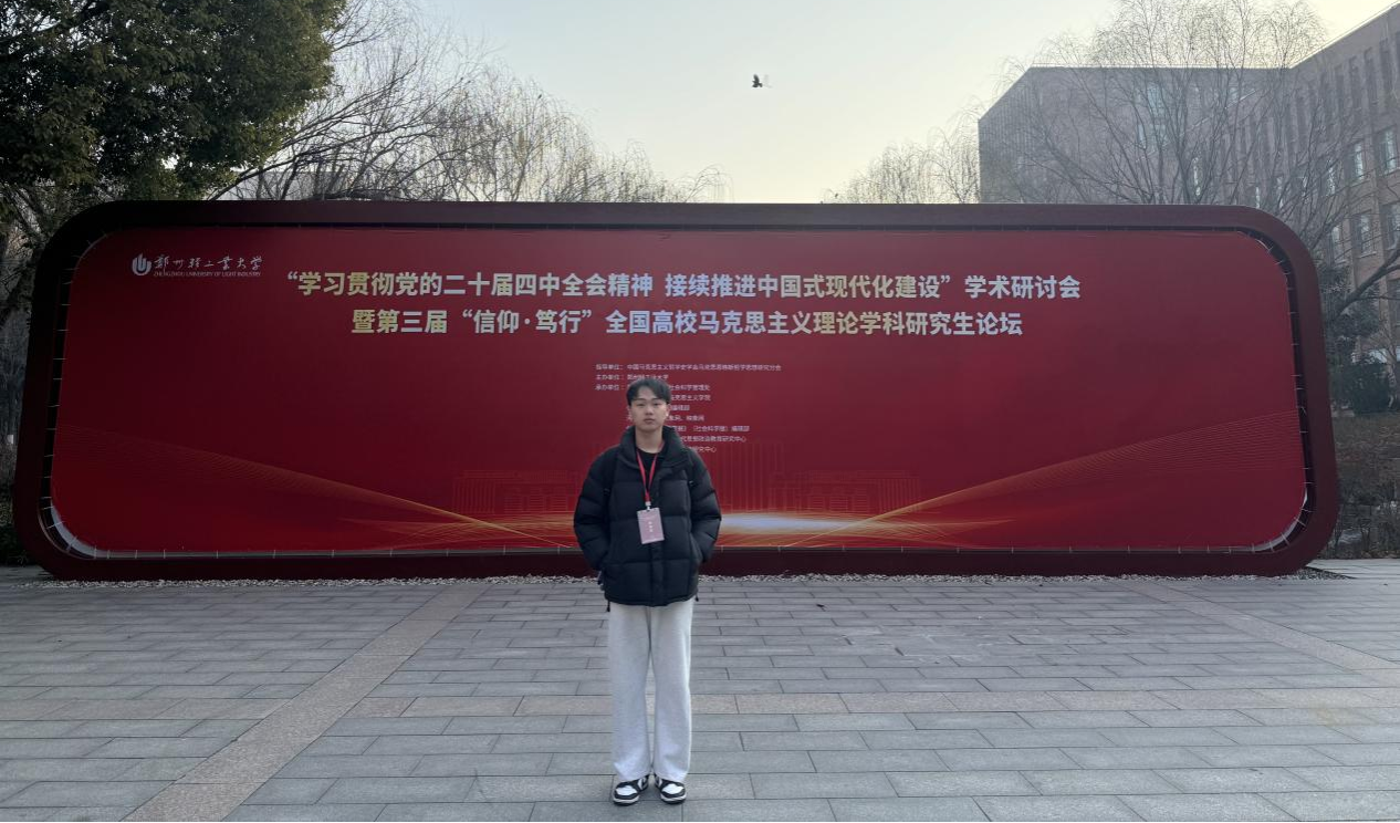 2025年12月28日,“学习党的二十届四中全会精神 接续推进中国式现代化建设”学术研讨会暨第三届“信仰•笃行”全国高校马克思主义理论学科研究生论坛在郑州轻工业大学成功举办。此次会议由中国马克思主义哲学史学会马克思恩格斯哲学思想研究分会指导、郑州轻工业大学主办,郑州轻工业大学社会科学管理处、郑州轻工业大学伟德国际1946源于英国、《学习论坛》期刊编辑部、大象网、映象网、郑州轻工业大学学报编辑部、郑州轻工业大学新时代思想政治教育研究中心、郑州轻工业大学河南精神研究中心承办。伟德betvlctor2025级研究生金国庆应邀参会,并在平行分论坛中发表学术报告。