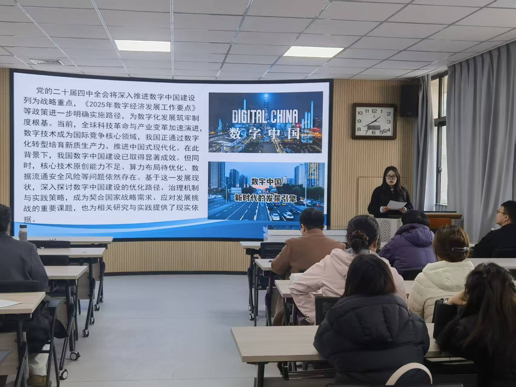 活动以“报纸阅读+时政分析”为形式,围绕《中国社会科学报》前沿文章展开深度研读与研讨。三位主讲研究生结合学科理论与时代关切,进行了每人10分钟主题汇报:田泽聚焦如何提升“提升智媒时代主流意识形态传播力”,阐释其时代意义与当代青年如何辨别网络信息真伪;任莹莹以“数字中国建设步入全面深化新阶段”为题,指出建设要以数据要素为基础,人工智能+为核心引擎、深度融合为路径,治理监管为保障的系统框架;寇姜汶基于学习贯彻党的二十届四中全会精神 深刻认识和把握“六个坚持”重大原则的视域下,分析十五五时期该如何继续坚持“六个坚持”。汇报主题涵盖国家战略、育人体系、精神引领等多个维度,展现了同学们扎实的理论功底与开阔的学术视野。